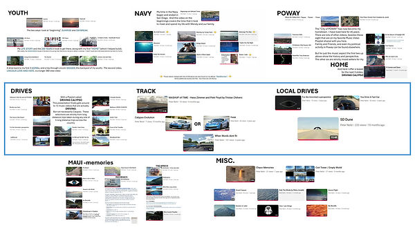 On the right here is the Entry Point to my second eBook on the "Driving Calypso" playlist. The videos I have made put to the music of my favorite artists make up the YouTube Playlist. What is shown here are the eight "Topics" that I have grouped them into for the purpose of the eBook. The topics include my YOUTH, my time in the NAVY, my home in POWAY, and three of the categories of my DRIVES, my time on the TRACK, LOCAL DRIVES in San Diego County and MAUI as well as some MISCellaneous ones thrown in for good measure.